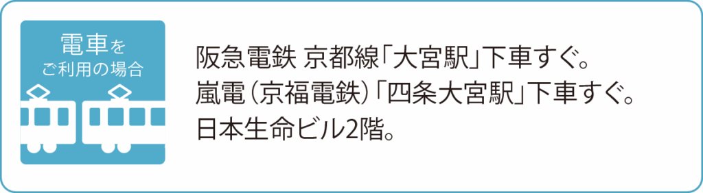 (阪急電鉄 京都線「大宮駅」下車すぐ。嵐電(京福電鉄)「四条大宮駅」下車すぐ。日本生命ビル2階)