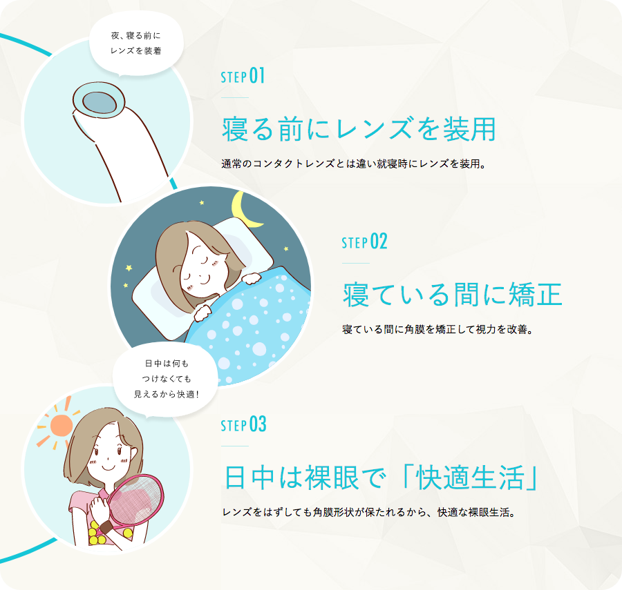 その特殊なデザインのコンタクトレンズが、寝ている間に角膜形状を平らに矯正することで、近視の改善を行います。